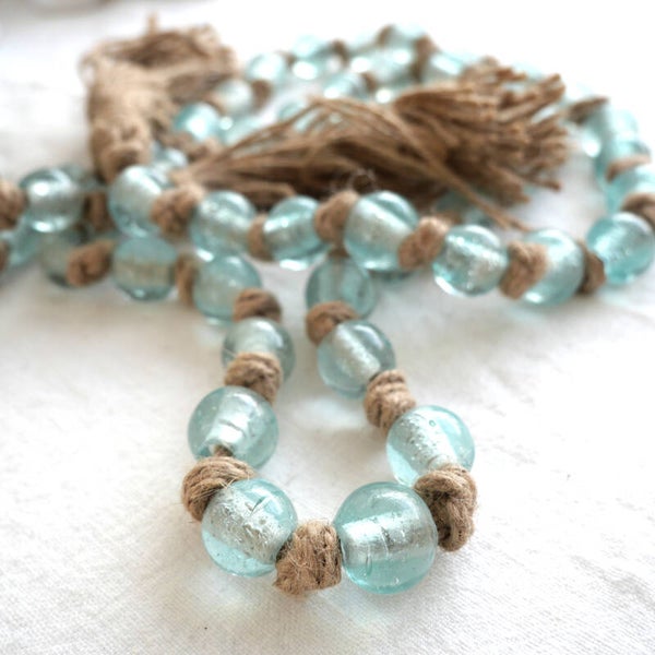 Breng een vleugje natuurlijke charme in je interieur met deze kralenslinger van gerecycled glas en jute – perfect als accent op een stapel boeken, in een schaal of hangend aan de muur.
