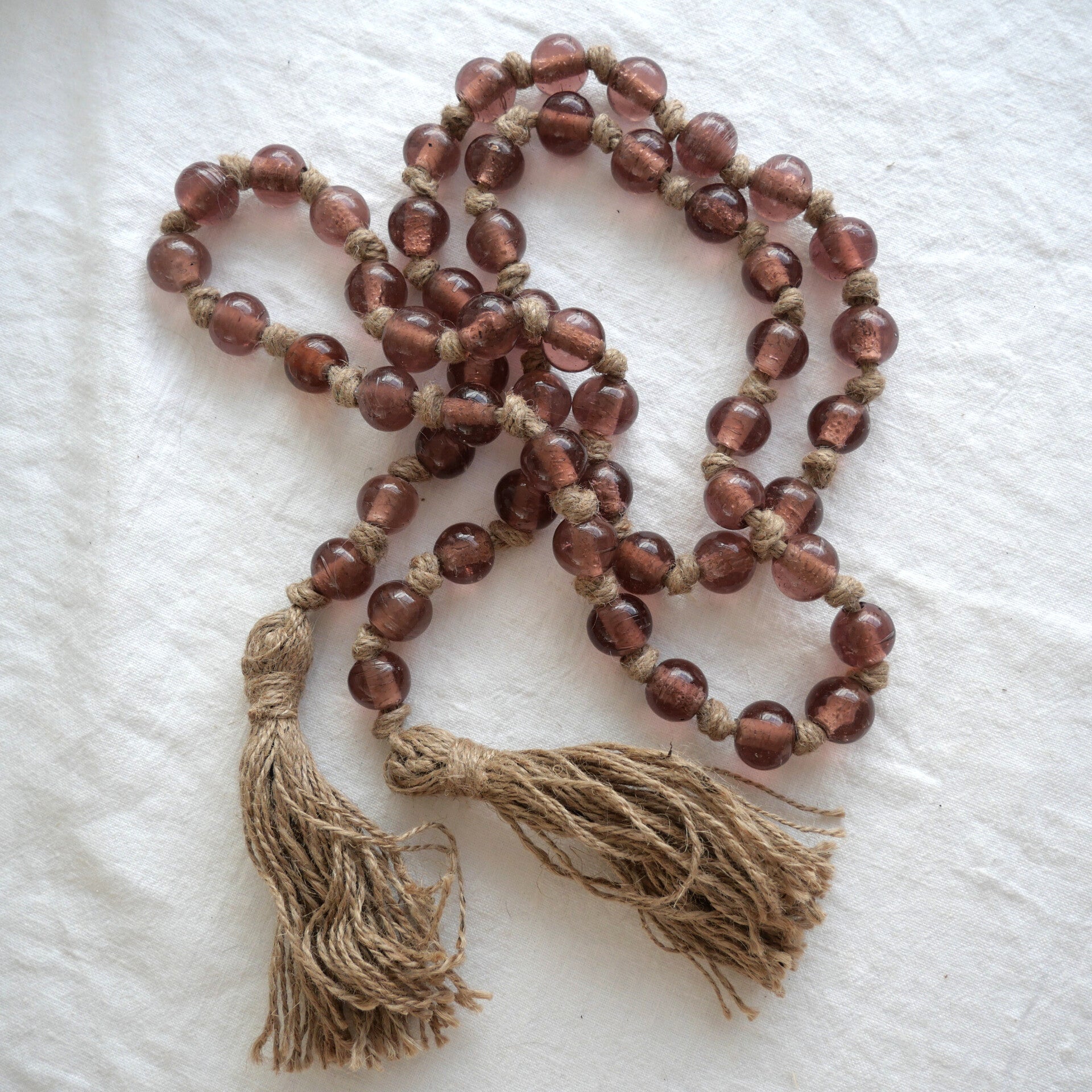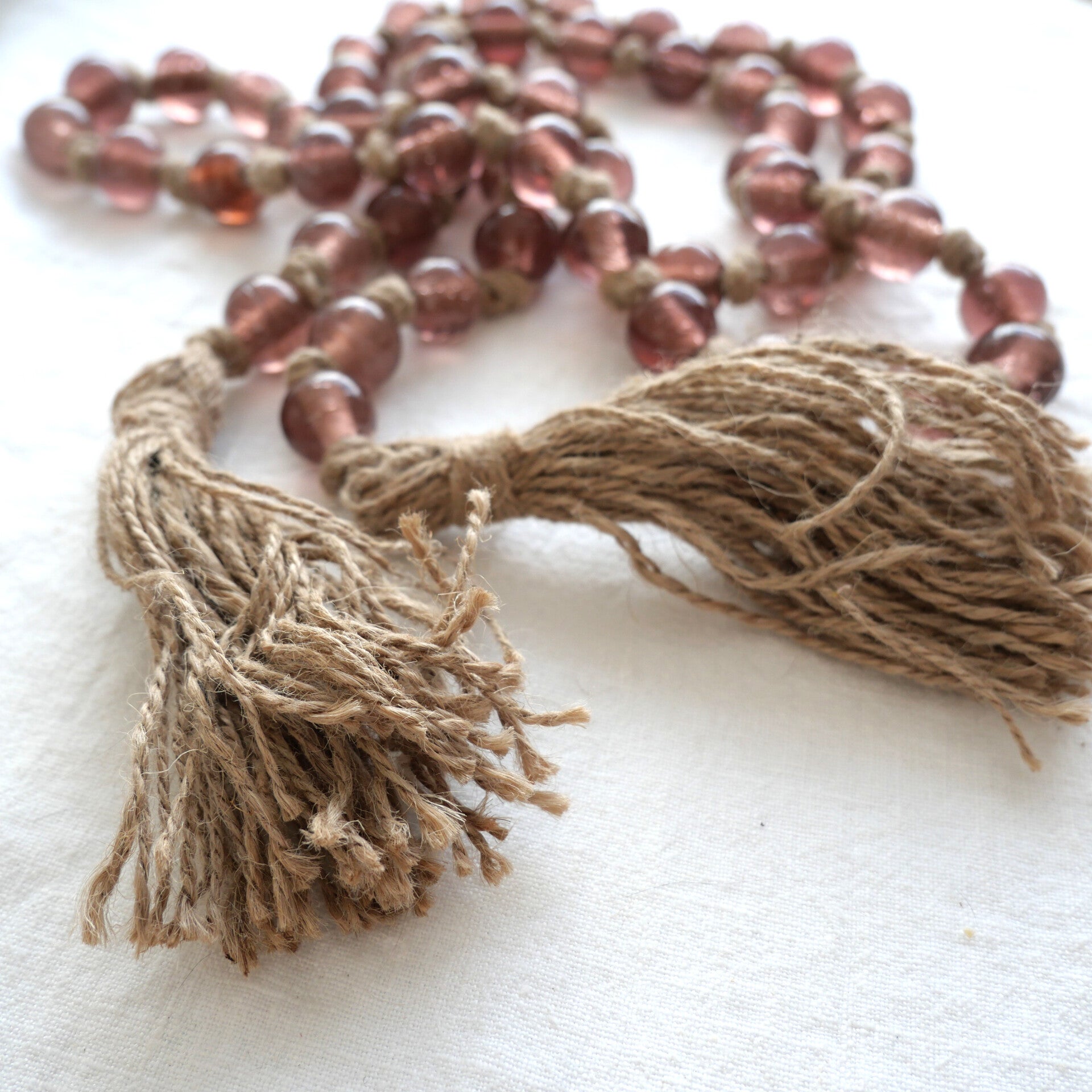 Breng een vleugje natuurlijke charme in je interieur met deze kralenslinger van gerecycled glas en jute – perfect als accent op een stapel boeken, in een schaal of hangend aan de muur.