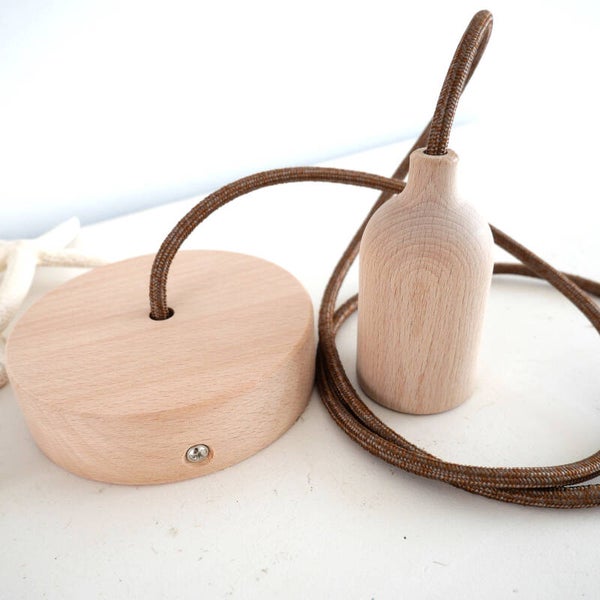 Handgemaakte houten hanglamp met gestoffeerde kabel en een houten plafondkap. Een natuurlijk, minimalistisch ontwerp dat perfect past bij Scandinavische, Japans- en boho-interieurs.