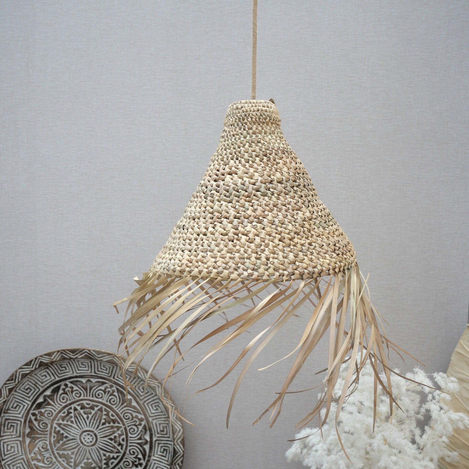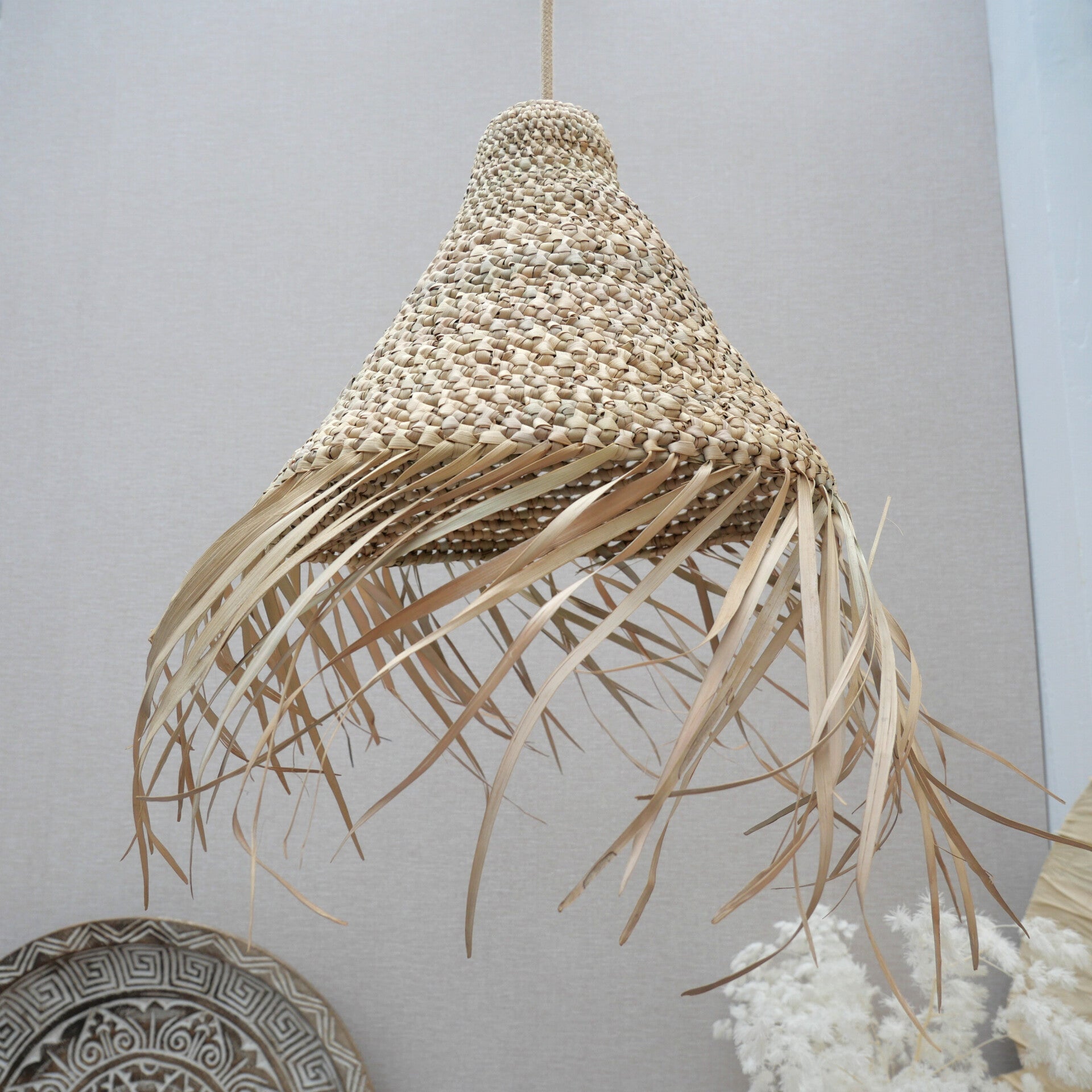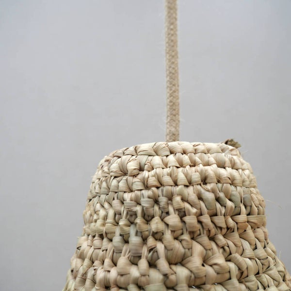 Lamp gemaakt met een knooptechniek van palmblad en franjes.