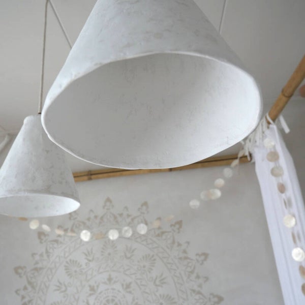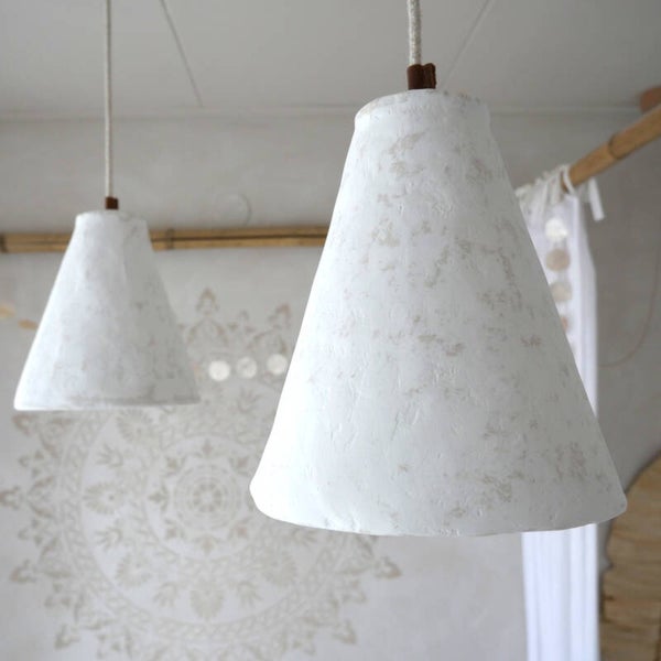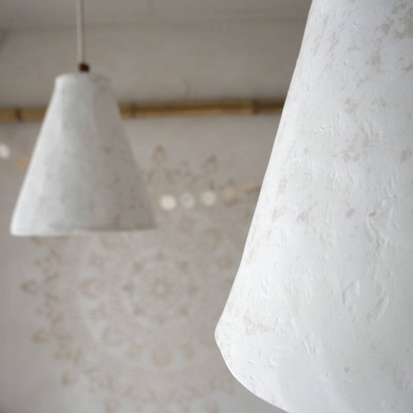 Haal rustige schoonheid in huis met deze handgemaakte wabi-sabi hanglamp. Deze unieke kegelvormige lamp, gemaakt van gepleisterd papier-maché, weerspiegelt de charme van natuurlijke imperfectie en kalm minimalisme.