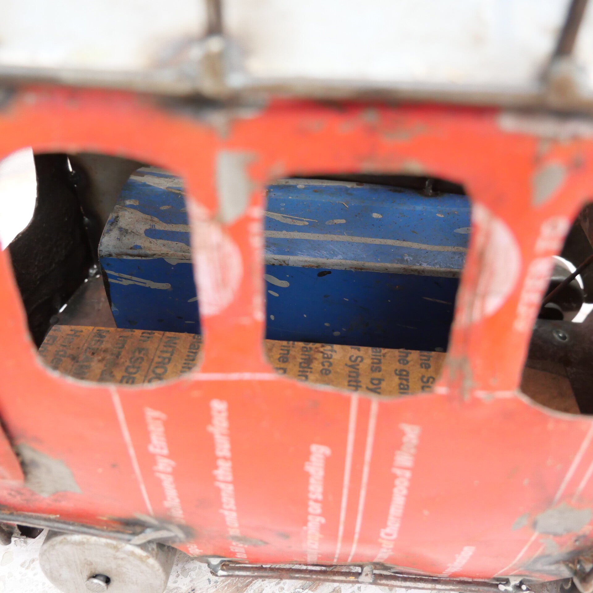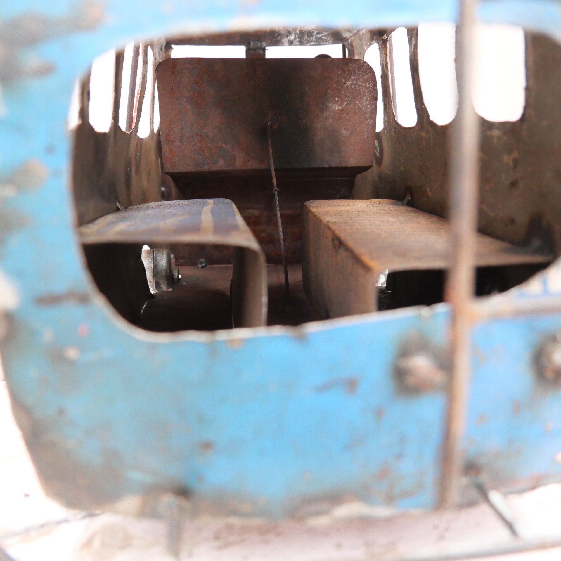 De bus zit vol charmante details: metalen stoelen en dashboard, een stuurwiel, een bagagerek bovenop en ruwe, rustieke wielen. De felle rode en blauwe tinten maken het een echte blikvanger.