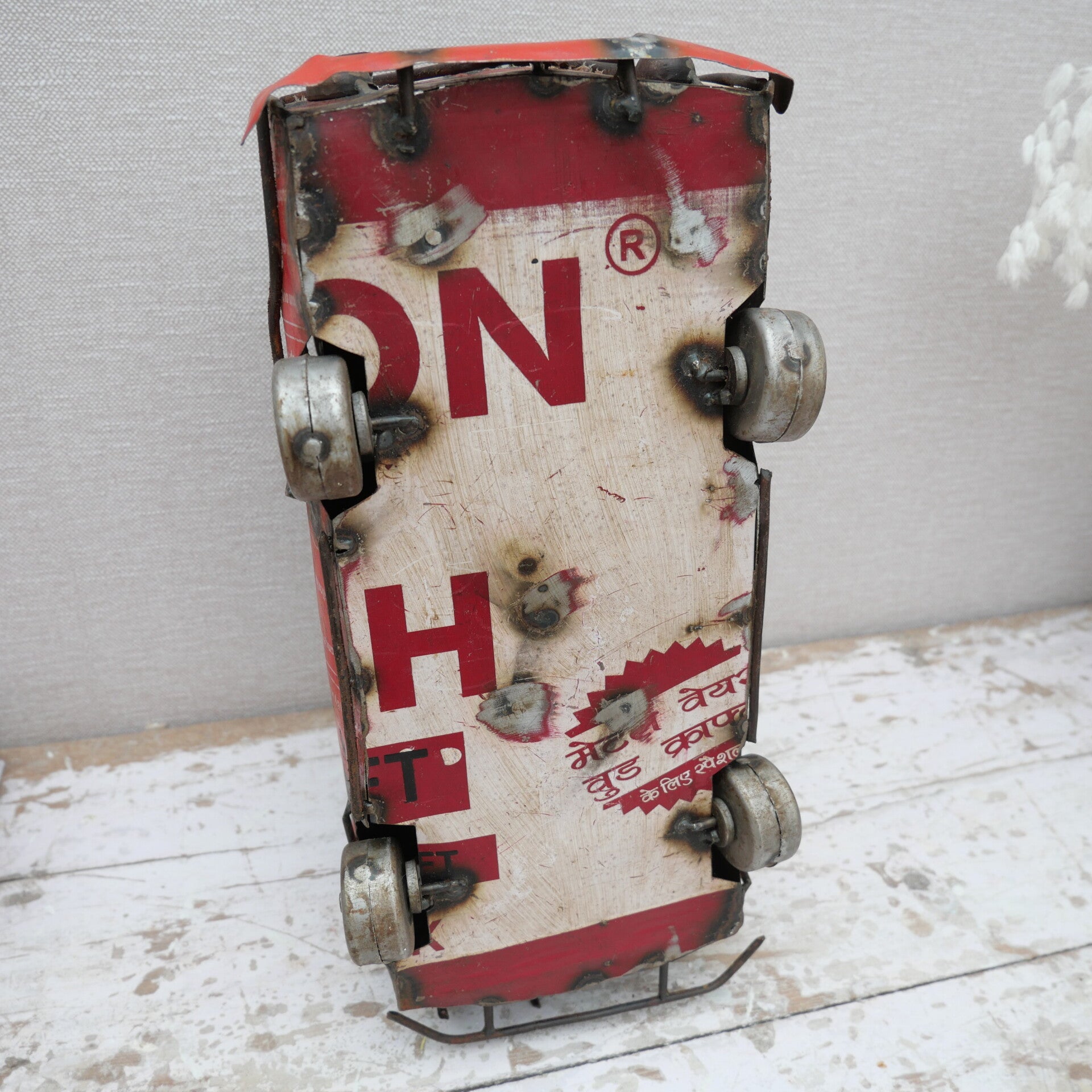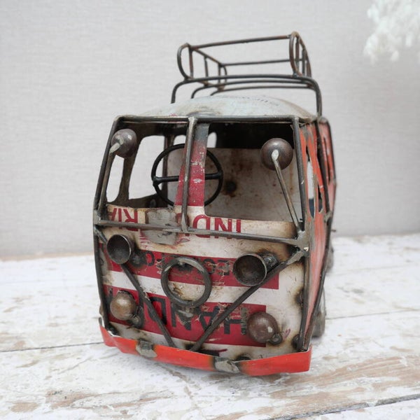 Dit unieke model van een Volkswagenbus is handgemaakt in India van oude gerecyclede olieblikken. Elk exemplaar is uniek, met zichtbare lasnaden, originele tekstopdrukken van de blikken en een prachtige verweerde industriële look.