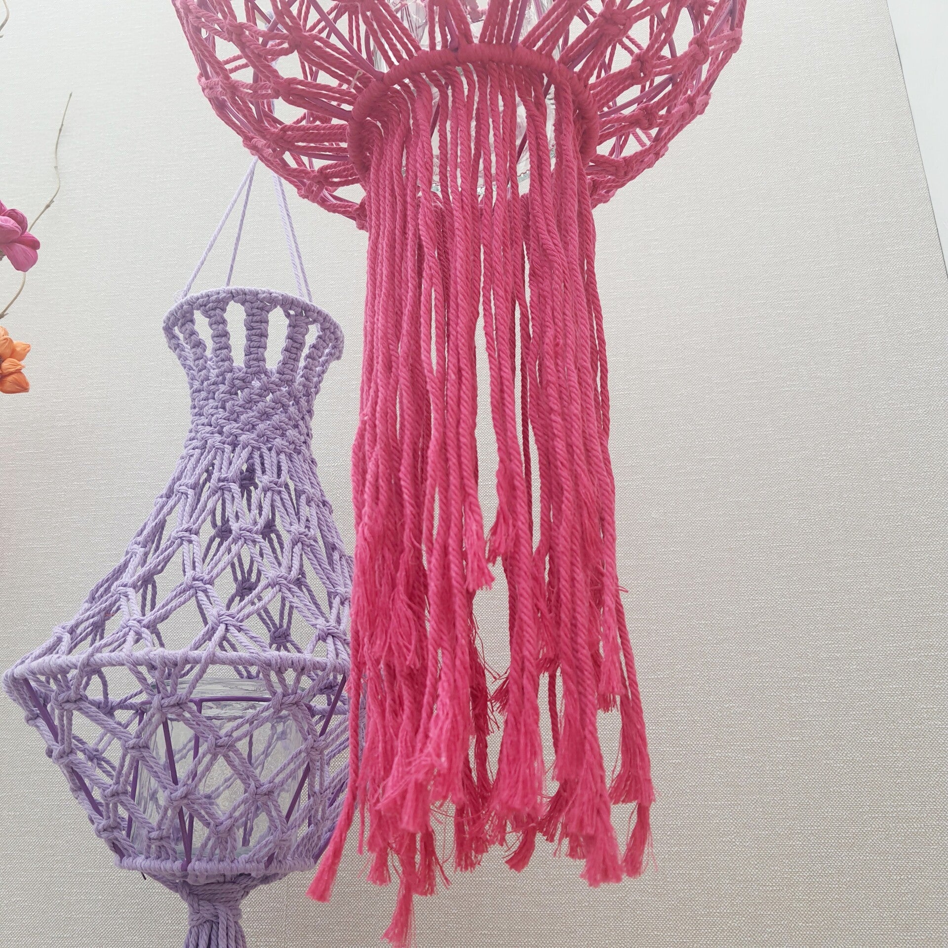 Voeg een speels kleuraccent toe aan je huis of buitenruimte met deze handgemaakte boho macramé lantaarns. Elk exemplaar is gemaakt met levendig katoengaren in roze en paarse tinten en wordt geleverd met een glazen inzetstuk voor een klein led-theelichtje of lichtsnoer.