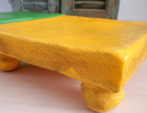 Deze kleurrijke vierkante verhogingen uit India zitten boordevol textuur en persoonlijkheid. Met hun zachte, ronde poten, handbeschilderde afwerking en verweerde patina vormen ze perfecte decoratieve platforms voor kaarsen, planten, rituelen of kleine voorwerpen. Elk exemplaar is handgemaakt van een mix van materialen – waarschijnlijk hout, papier-maché of klei – en afgewerkt met donkerdere was voor een authentieke, verweerde look.