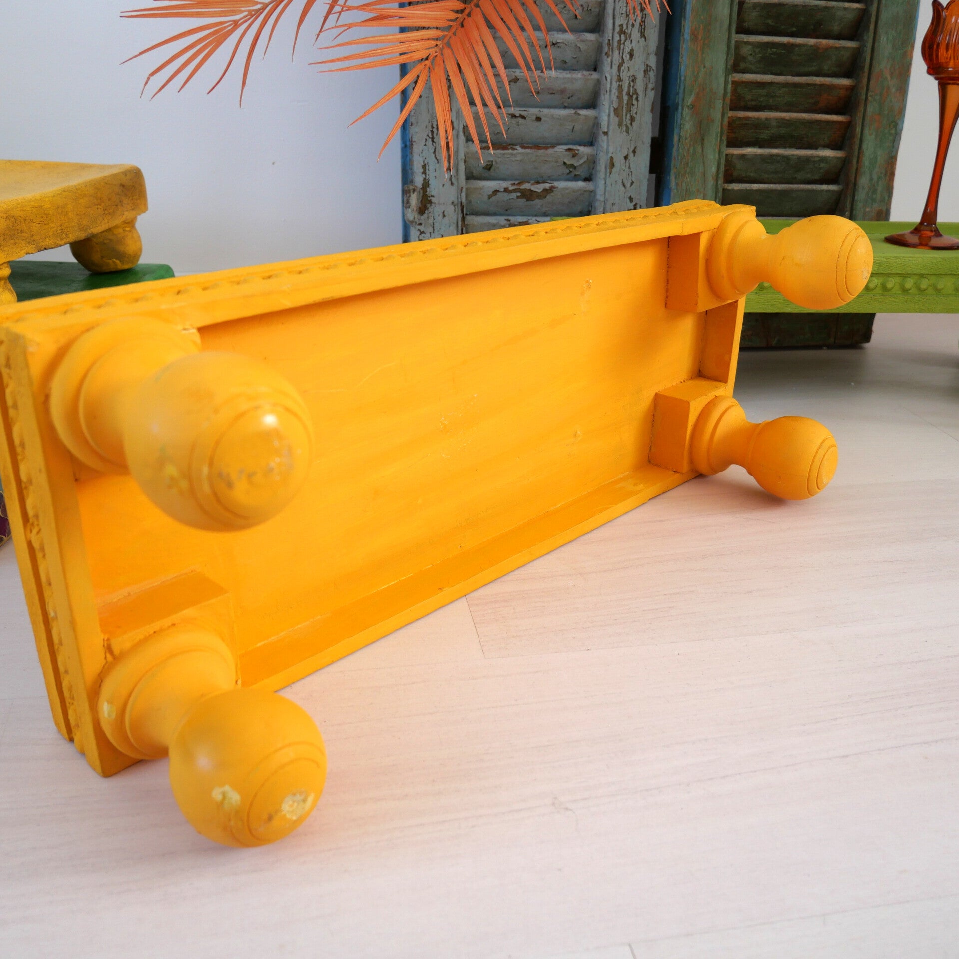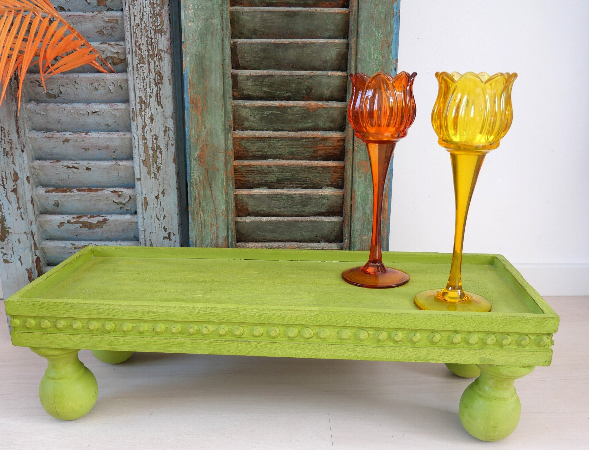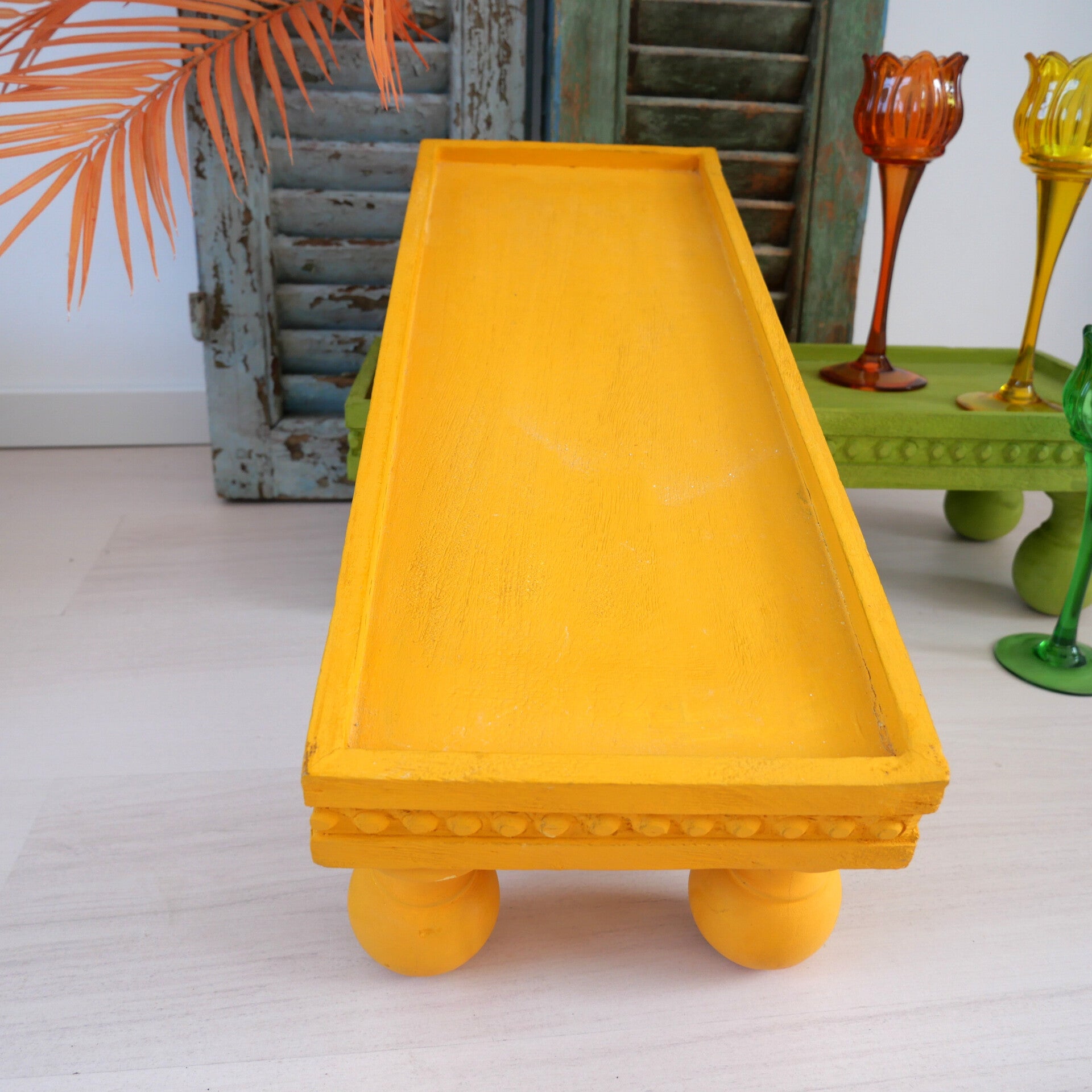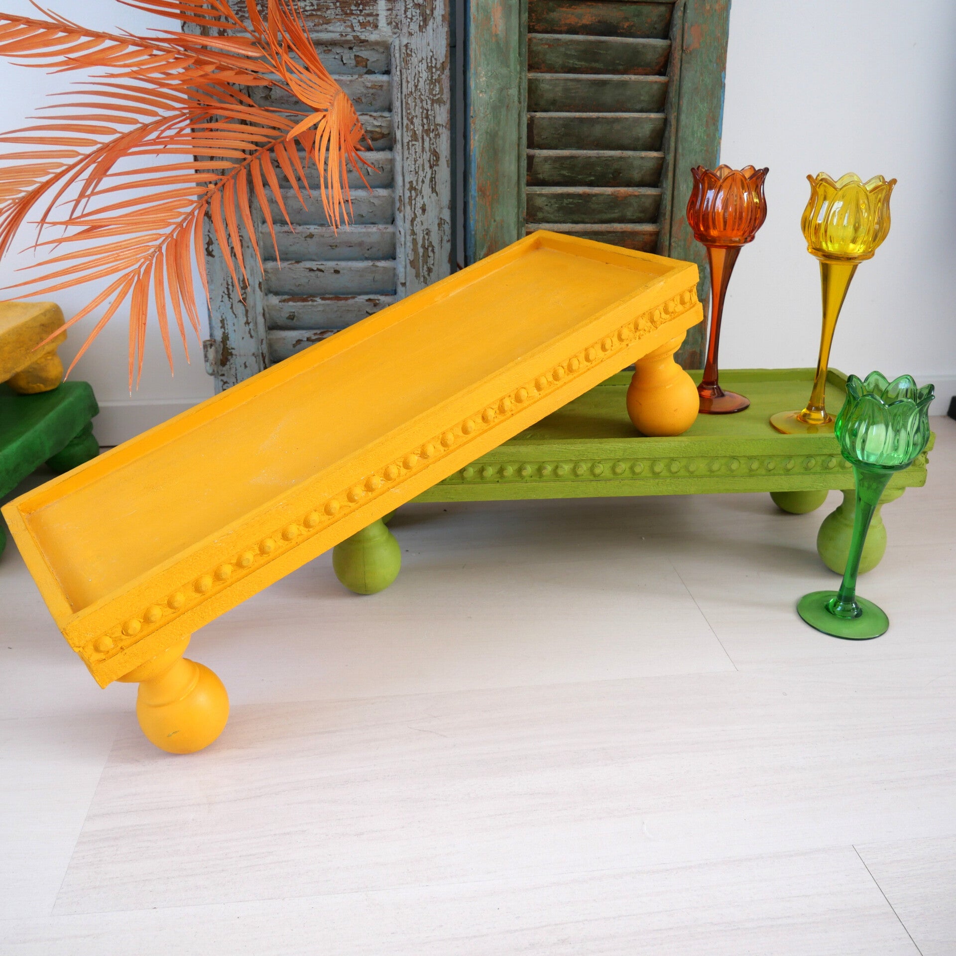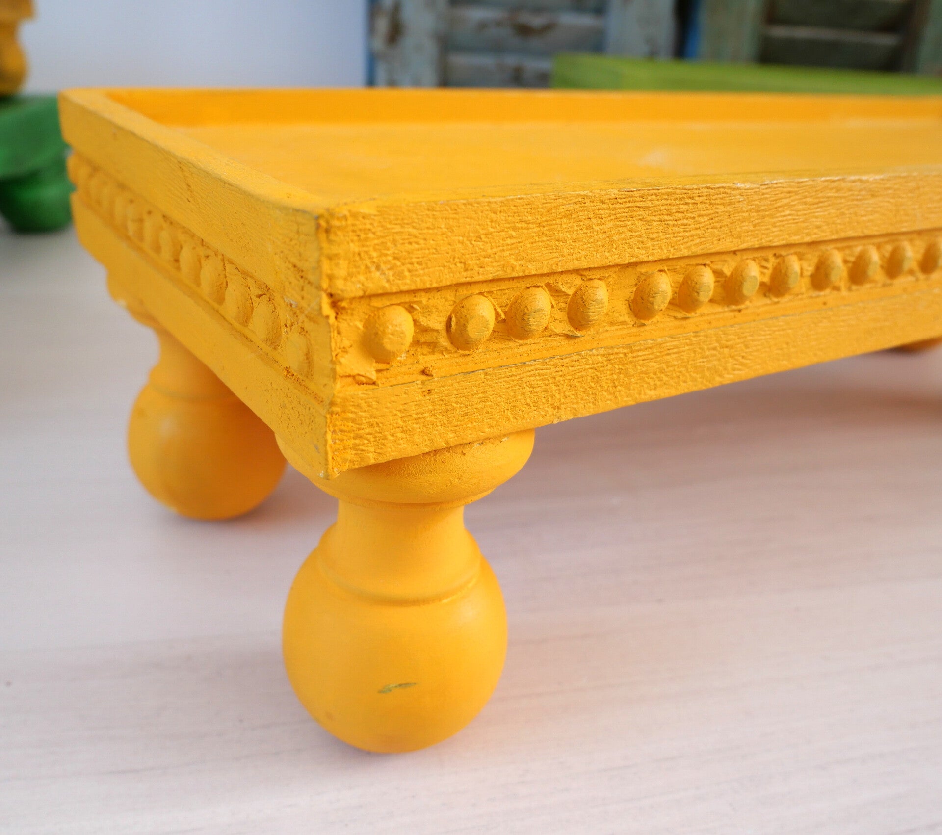 Breng kleur en karakter in je huis met deze levendige houten opstaande tafels uit India. Handgemaakt van massief hout en geverfd in opvallend geel of frisgroen, heeft elke tafel gedetailleerde, gebeeldhouwde randen en speelse ronde poten.