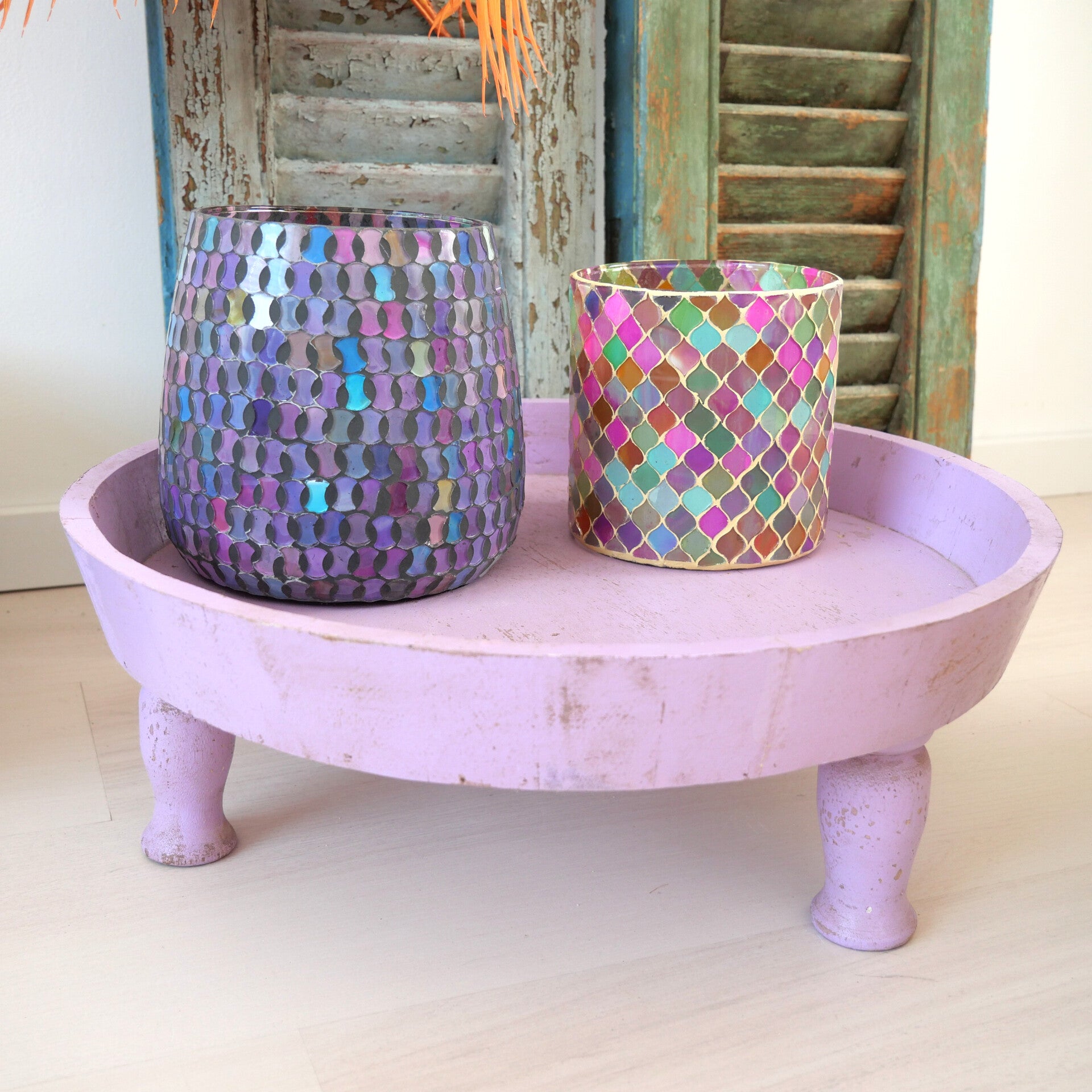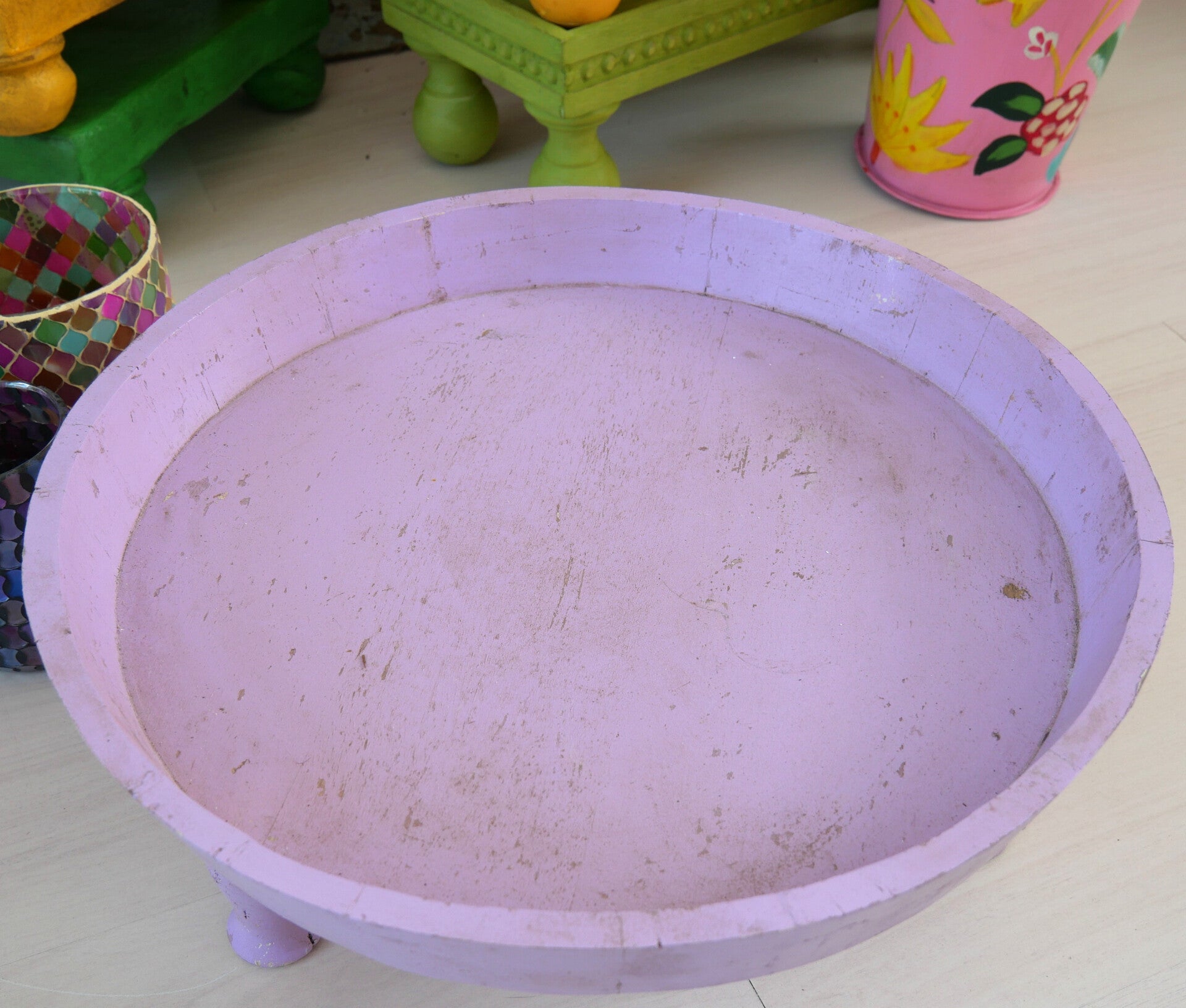 Deze charmante houten tafel met opstaande rand uit India voegt een speels tintje toe aan je huis. Hij is handgemaakt en geverfd in een zachte paarse tint. De verweerde afwerking geeft hem een vintage, boho-achtige uitstraling.