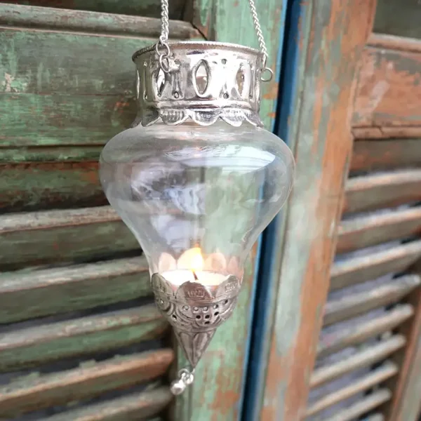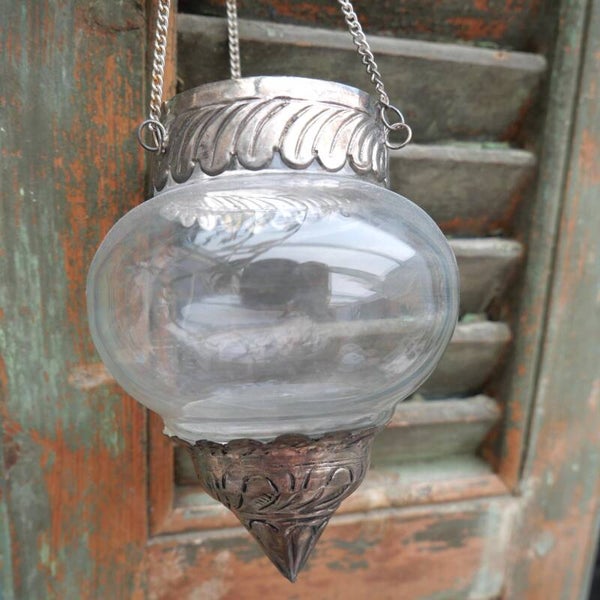 Boho oosterse lantaarns van zilver (getint) en glas – perfect als hangende kaarsenhouders of als unieke woondecoratie. Breng een dromerige 1001 nacht-sfeer in je ruimte met deze handgemaakte hanglampen.